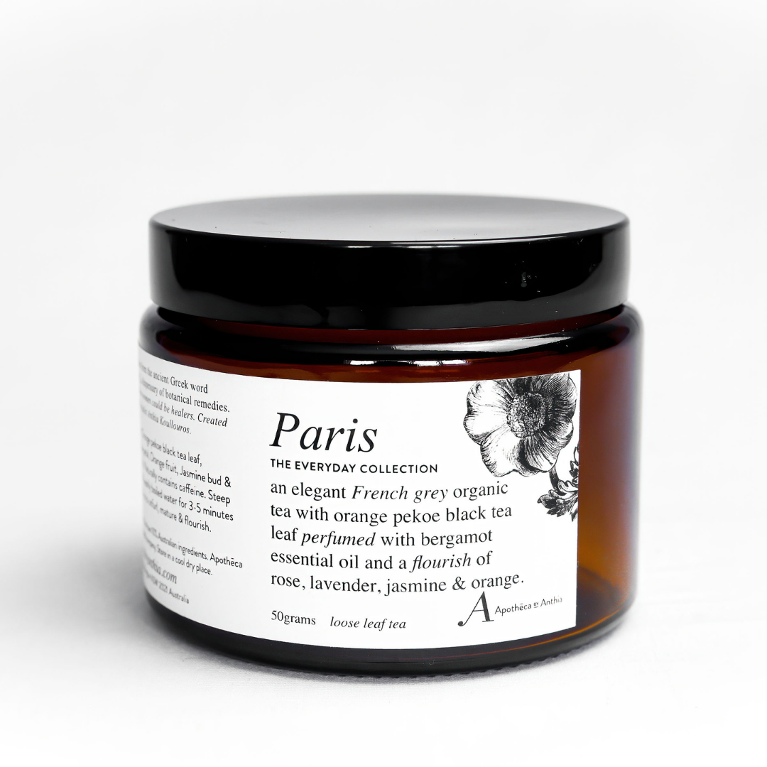 An elegant French grey organic tea with orange pekoe black tea leaf perfumed with bergamot essential oil and a flourish of rose, lavender, jasmine & orange.
