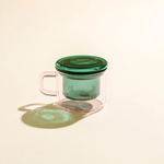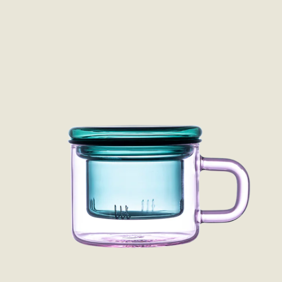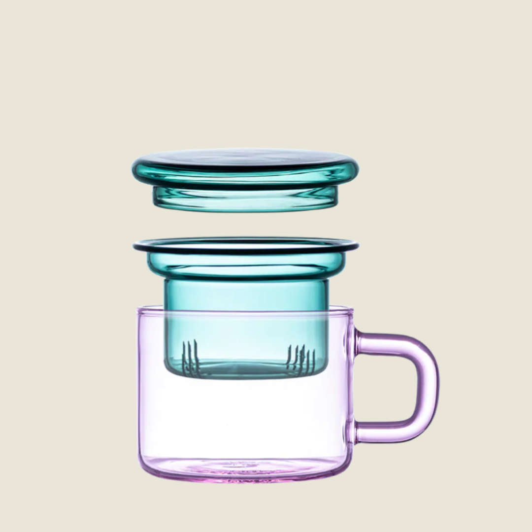 A beautifully crafted and thoughtfully created glass mug, infuser and lid.